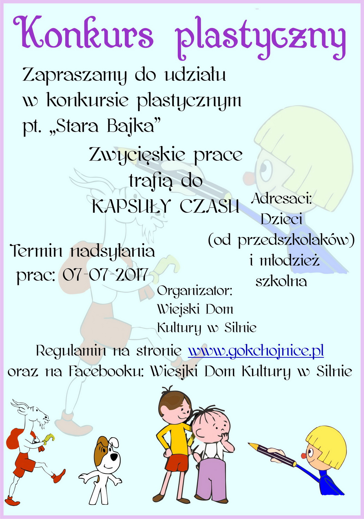 Wiejski Dom Kultury w Silnie zaprasza do udziału w konkursie plastycznym "Stara Bajka". Termin składania prac do 7 lipca.